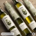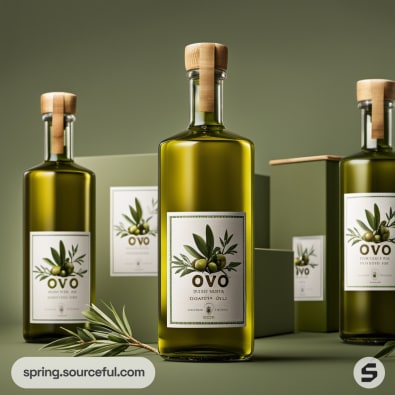 Three green olive oil bottles with herb and lemon decorations.