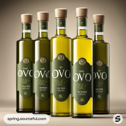 Five olive oil bottles with green labels and cork tops.