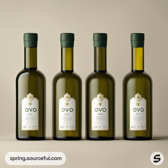 Four green olive oil bottles with dark caps on beige background.