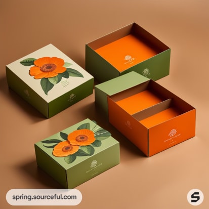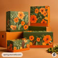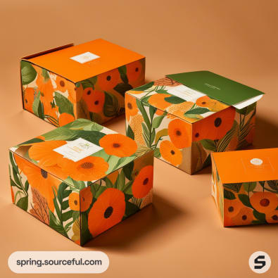 Colorful floral-themed cardboard boxes with orange and green design patterns on a light brown background.