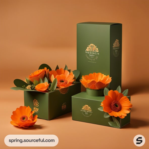 Green packaging boxes with orange flower designs on a brown background.