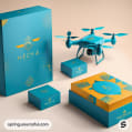 Teal drone and matching packaging with gold accents.