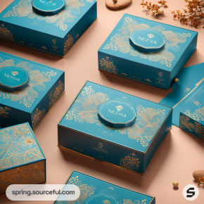 Teal gift boxes with gold floral patterns and circular labels.