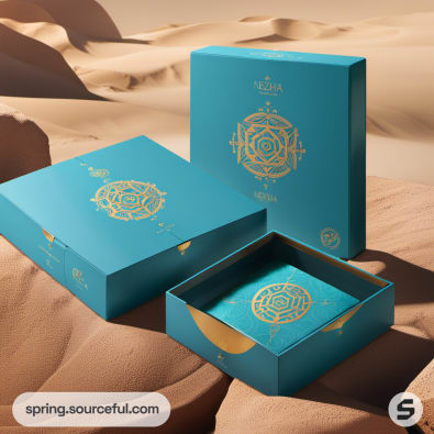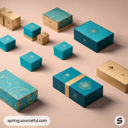 Collection of teal and gold boxes on beige background.