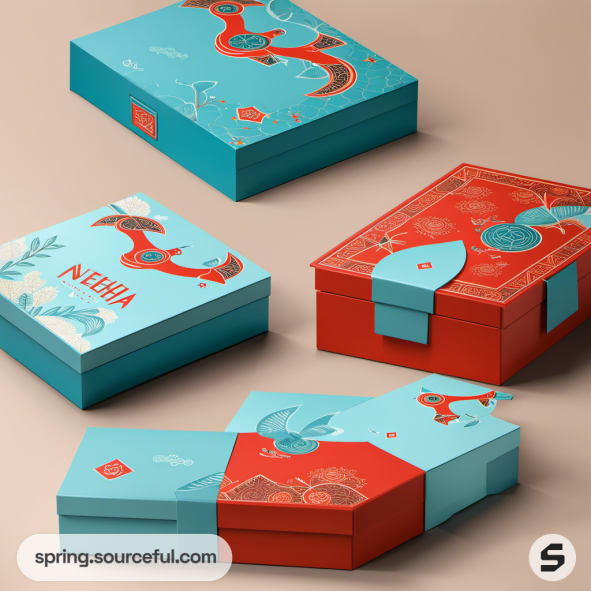 Teal and red decorative box packaging on beige surface.