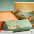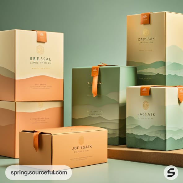 Stacked eco-friendly gift boxes with gradient designs in green and peach tones on a green background.
