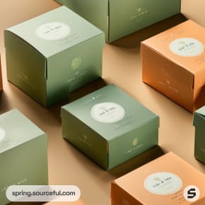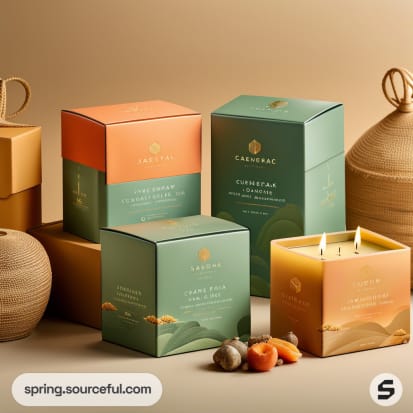Candle boxes in green and orange shades with minimalist design on a beige background.