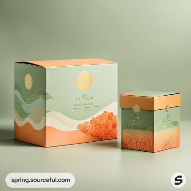 Two carton boxes with wave patterns and orange accents on a pale green background.