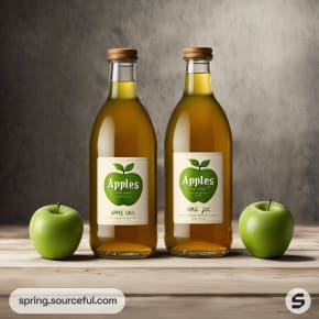 Two apple juice bottles with green apples on a neutral background.