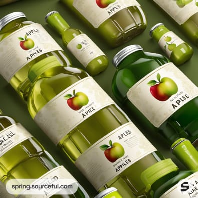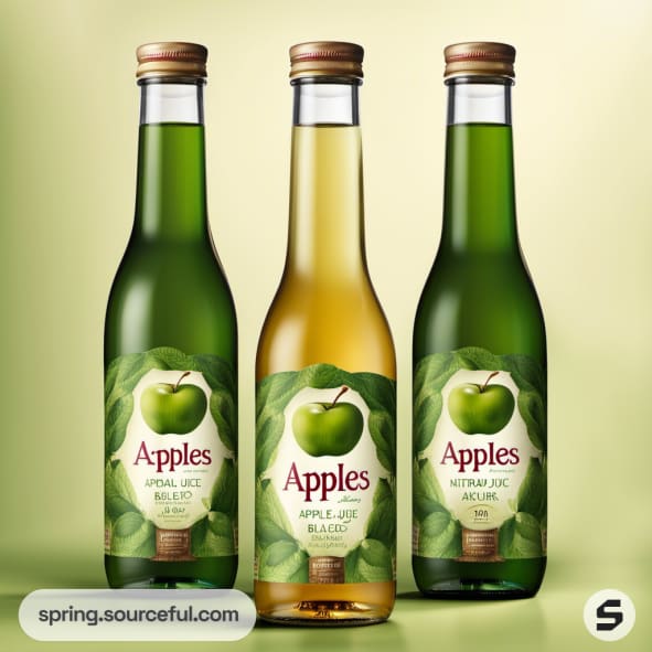Assorted apple juice bottles with apple graphics on olive green labels.