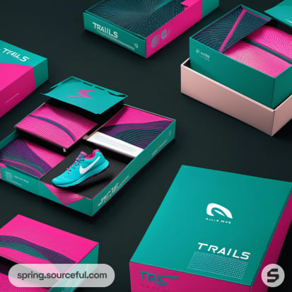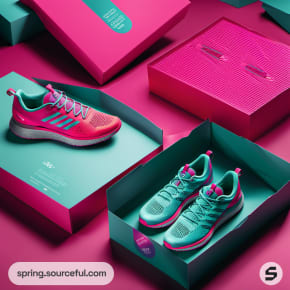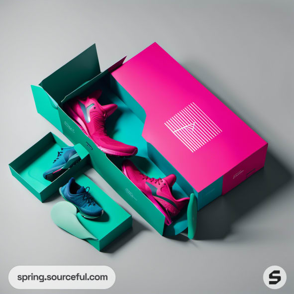 Pink and teal shoe box with sneakers inside, open packaging.