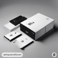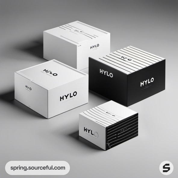 Minimalist black and white packaging featuring boxes and envelopes on a gray background.