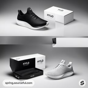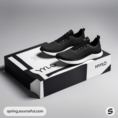 White sneakers partially out of a sleek black and white shoebox with minimalist design.