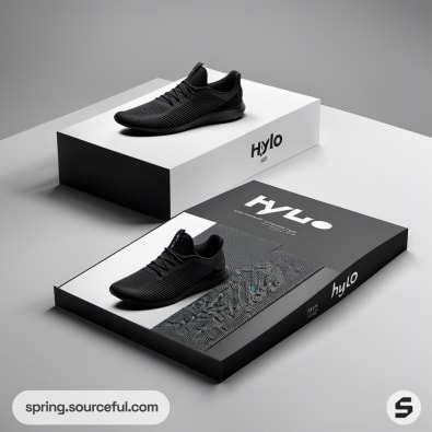 Black and white branded sneakers with sleek, modern design next to matching minimalist shoe boxes on gray background.
