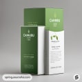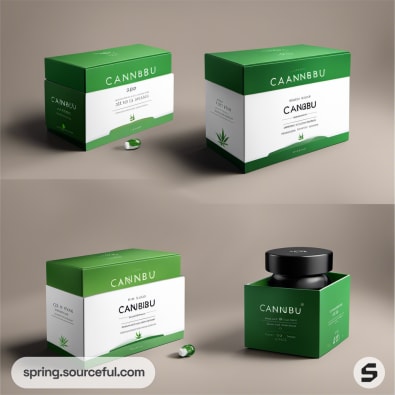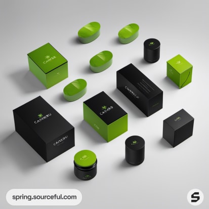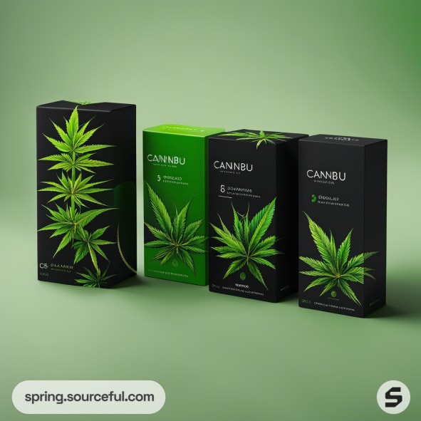 Four green and black product boxes with cannabis leaf designs on a green background.