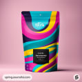 Colorful coffee pouch with bold abstract patterns on a pink background.