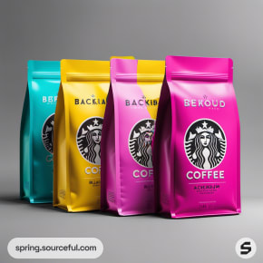 Brightly colored coffee bags with a central circular design.