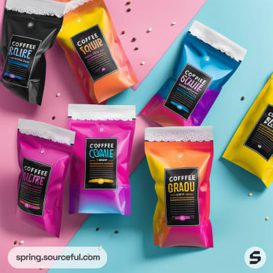 Coffee pouches with bold colors and labels on a pink background.