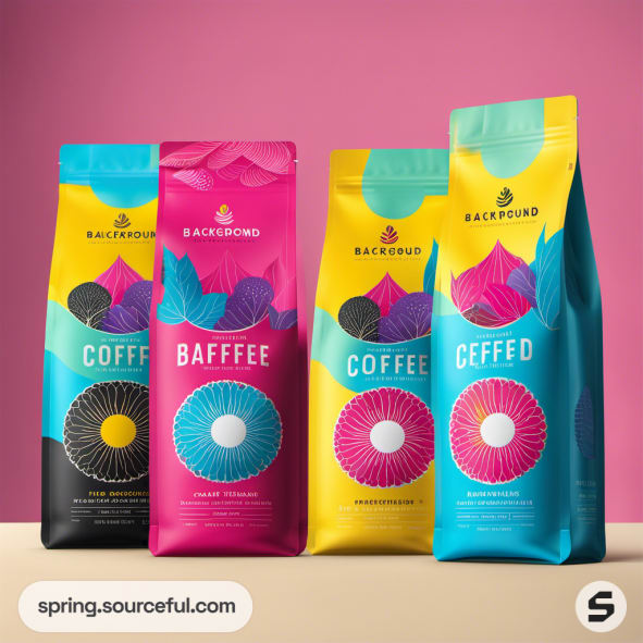 Colorful coffee bags with vibrant designs on a pink background.