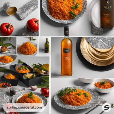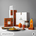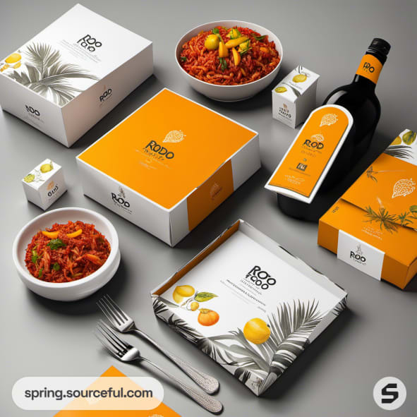 White and patterned packaging with plated dish and orange bottle.