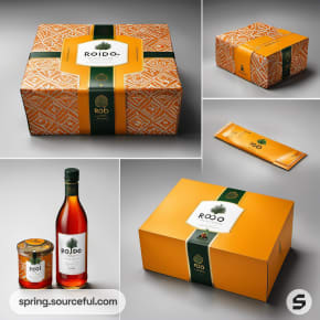 Green and orange patterned packaging with various containers and bottle.