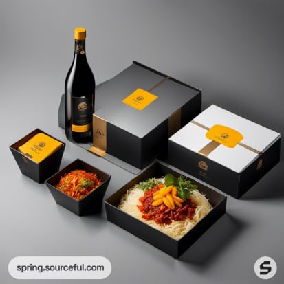 Black and gold packaging with plated pasta and wine bottle.