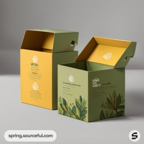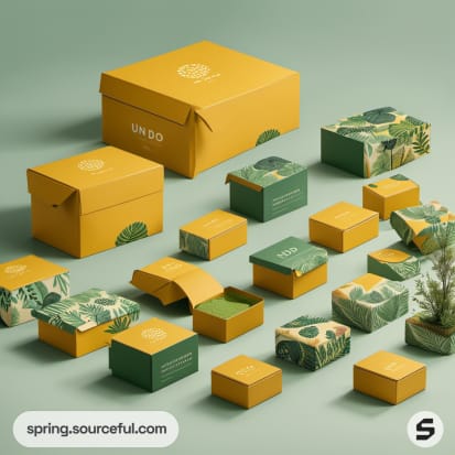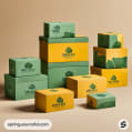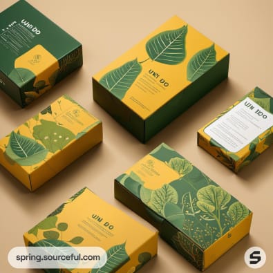 Assorted green and yellow boxes with leaf designs on beige surface.