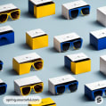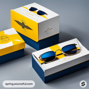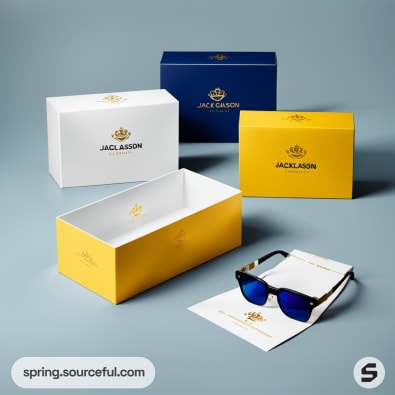 Blue-lensed sunglasses and folded boxes in white and blue with yellow accents.