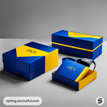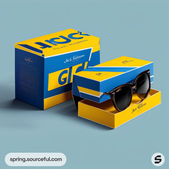 Sunglasses displayed with a blue and yellow open box on a light blue background.