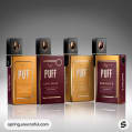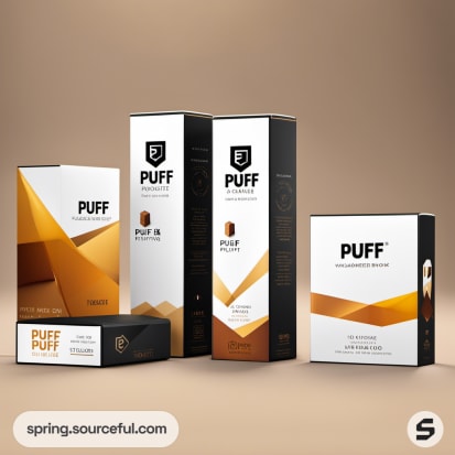 Brown and white packaging for PUFF items, sleek and modern design.