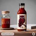 Various owl-themed sauce bottles with vintage-style labels.