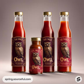 Four owl-themed sauce bottles with dark labels.