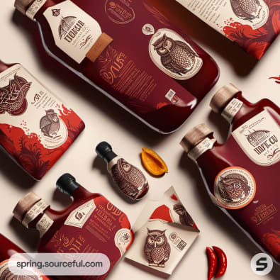 Owl-themed sauce bottles and box with detailed illustration.