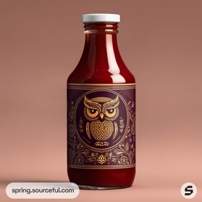 Bottle with intricate owl design on dark purple label.