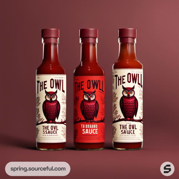 Three bottles of owl-themed sauce on dark red background.