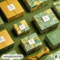 Assorted yellow and green gift boxes with plant motifs and rope ties on a green backdrop.