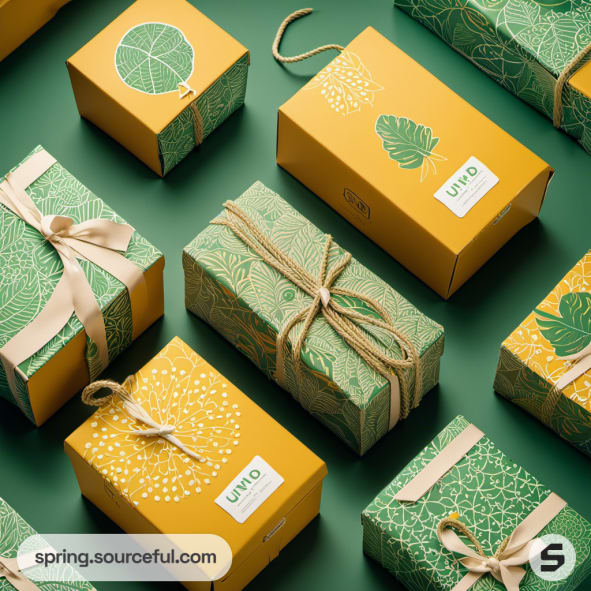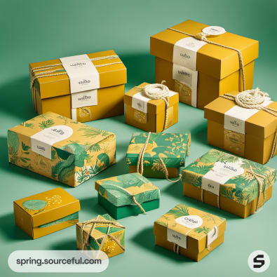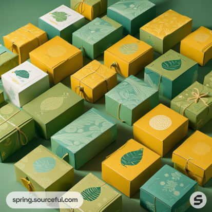 Mix of green and yellow packaging boxes with leaf designs and natural textures.