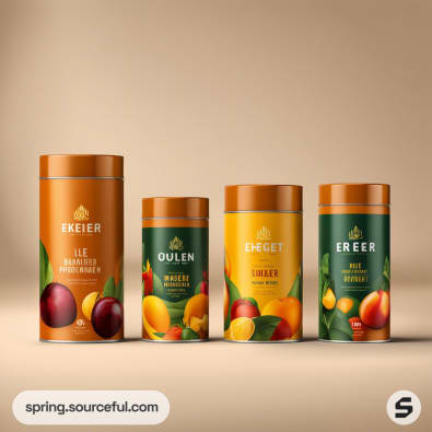 Silver tins with vibrant fruit graphics and white labels featuring various fruits and text, on a beige surface.