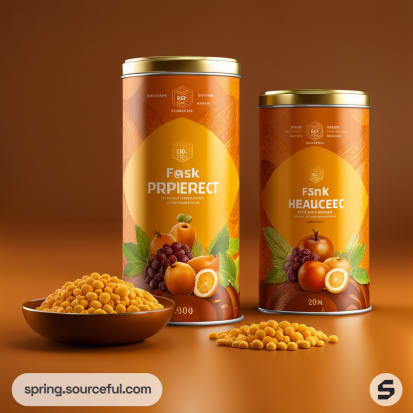 Two cylindrical containers with green labels, featuring vibrant images of peaches and berries.