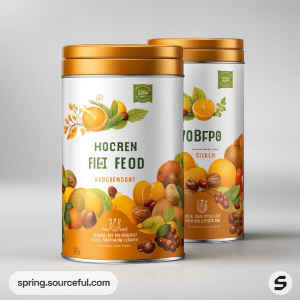 Two cylindrical tins with fruit designs featuring dried nuts and amber-flavored mix on a beige background.