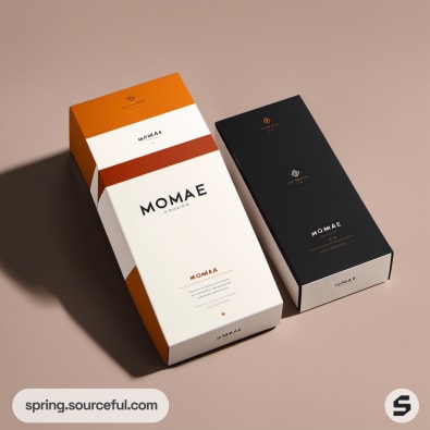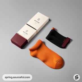 Orange and black sock packaging boxes on beige background.