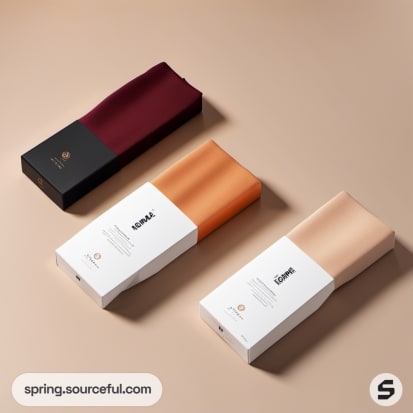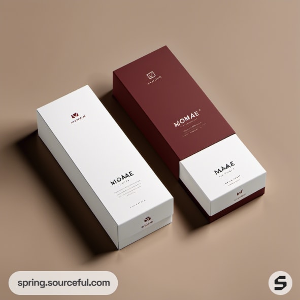 White and maroon rectangular sock packaging boxes.