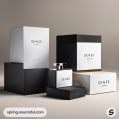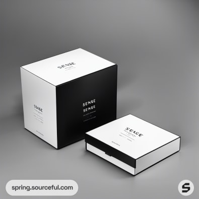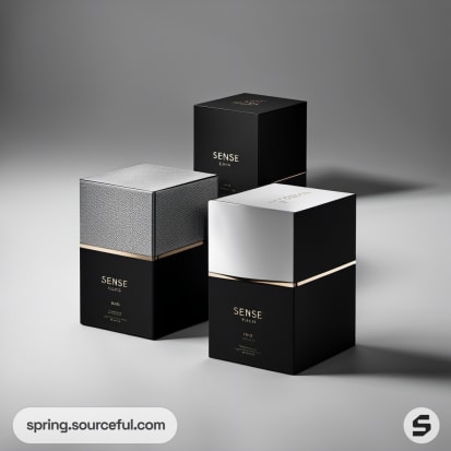 Sophisticated black packaging set with angled lids, 'Sense' branding.