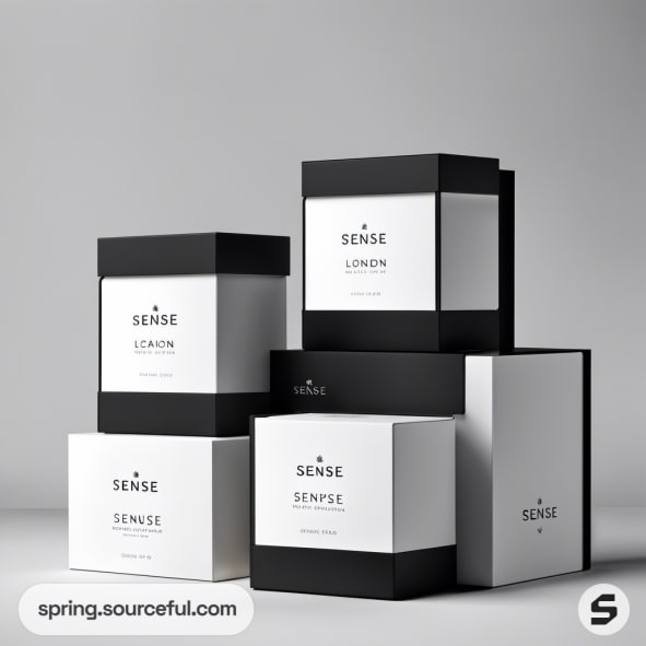 Assorted black and white boxes arranged showcasing 'Sense' label.