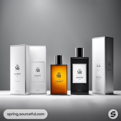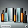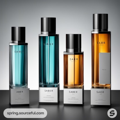 Multiple perfume bottles with turquoise boxes and amber highlights.