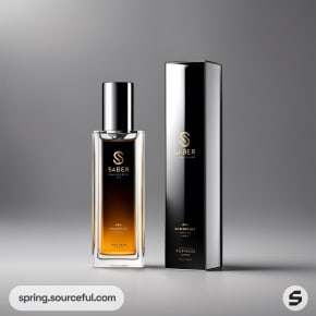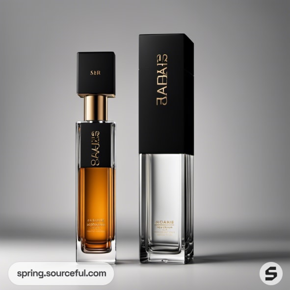 Two perfume bottles with matching tall boxes, one amber, one blue.