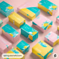 Colorful boxes with tropical designs; blue, yellow, and pink themes with leaf and fruit graphics.