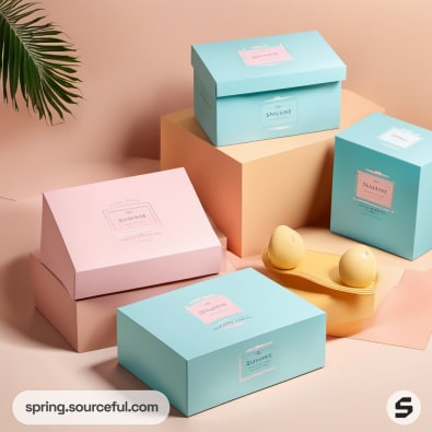 Assorted pastel packaging boxes on a beige surface with leaves.