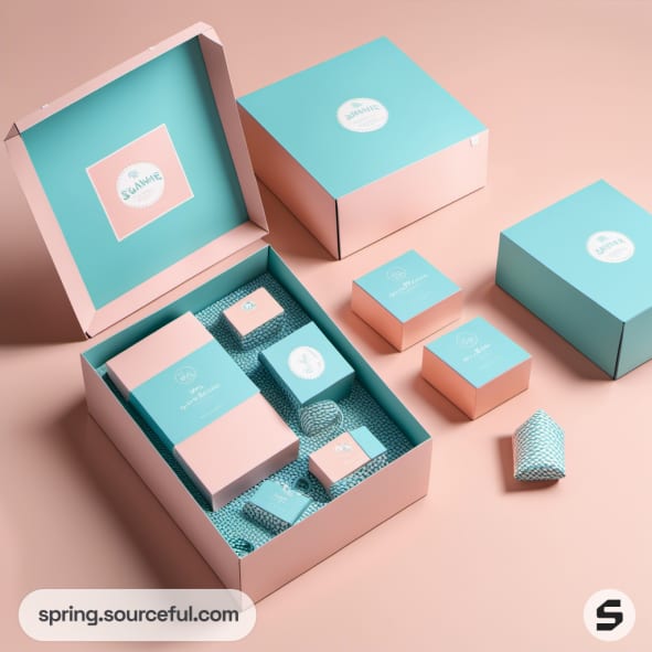 Pink gift boxes on turquoise background; various sizes, with delicate patterns and small label details.