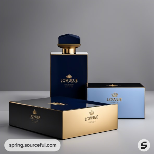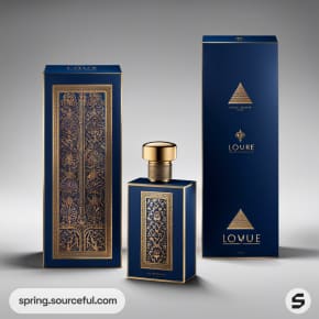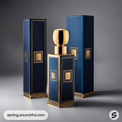 Blue and gold rectangular bottles in rich packaging design.